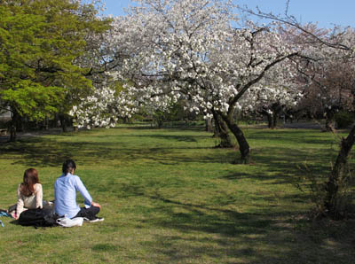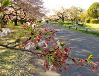 | ”あまやどり”は サクラの中では園内一の甘い良い香りがします! 20番通りに面した「標準木」(写真 右)は散ってしまいましたが、下の段のソメイヨシノが満開ですし、これから咲き出すサトザクラもあって まだまだ楽しめます。 |