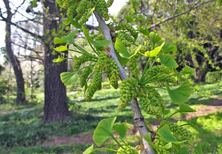 | 門をはいってすぐのイチョウ。 短枝に付く葉が大きくなってきました。 芋虫のようなものは雄花。 |