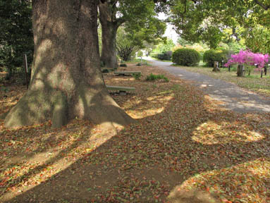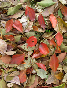 | 足元は枯れ葉でいっぱい。 右の写真はきれいな葉を集めて並べたもの。 |