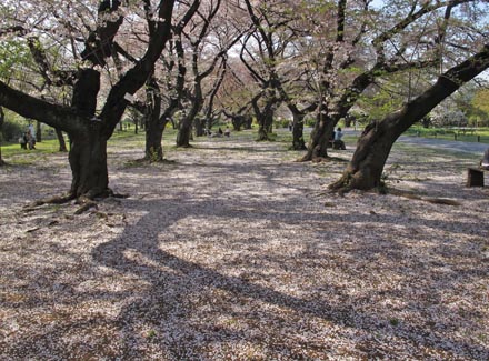 | ソメイヨシノは 13 ・14日が花吹雪でした。 舞散る花びらまでは写せません。 |