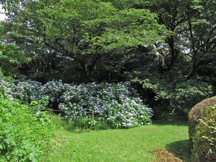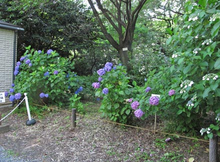 | 本館裏にアジサイ園がある。 薬草保存園の左右の通り、30番・40番通りのスタート地点にあたる。 西洋アジサイ と アジサイの区別が難しい。 アジサイよりも種子ができやすく、海外で園芸品種が作り出された。 |