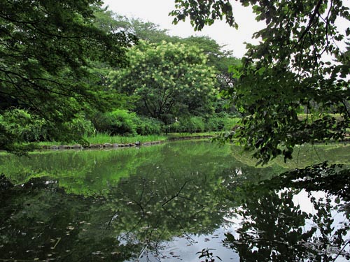 | 中島池のほとりです。 右側のハギ園はもう少し・・。 正門方向を見ている。 |