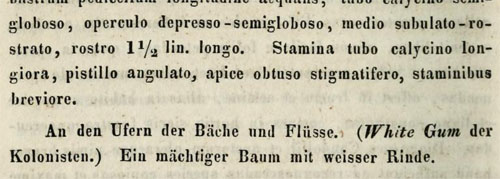 | 図版は無い。ドイツ語による最後の2行は「小川や河川の岸に生える。(植民地のホワイトガム)白い樹皮の巨木」で、産地の記載は無い。 |