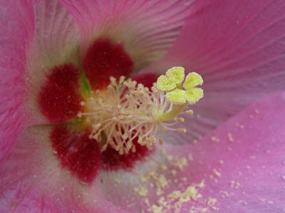 | 5裂した柱頭に花粉がついている。多数の雄しべは花柱の周りで合着。子房が全く見えないので、下位子房かと思ってしまう。 |