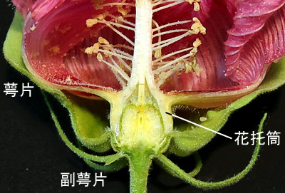 | 副萼はフヨウ属に共通する特徴で、ハマボウやオオハマボウでは浅く10裂して、萼が二重になっているように見える。 |