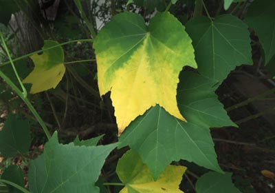| 伸び始めから花がつくまでは5裂の大きな葉で、葉柄も長いが、腋に花をつけるようになるとほぼ3裂となる。鋸歯は波状で一定しない。幼葉では毛が密となって白っぽく見える。 |