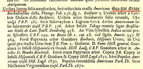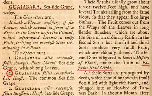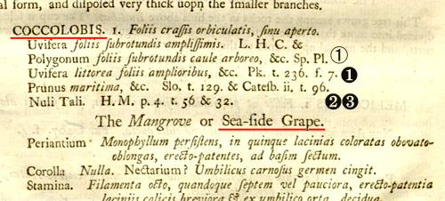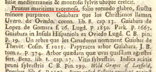 ❷は『Catalogus Plantarum quae in Insula Jamaica』p. 183 に記載したもの。その意味は「総状花をもつ海のプルヌス属」。小さなスモモのような実が総状につく様を表したものだろうか?ここにも無数の参考文献が列挙されており、のちにミラーが記載する Guaiabara の名称が多数みられる。 |
