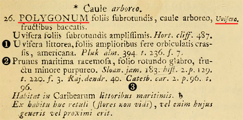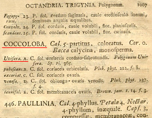 リンネは『植物の種』でタデ属としていた属名を COCCOLOBA に直して、A. ~ E. の5種を記載している (A.が本種)。ここで注目すべきは、COCCOLOBA