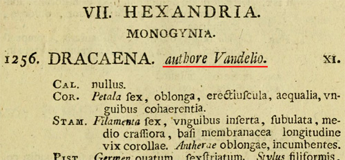 筆者が基準としている GRIN-Global のデータやその他のサイトでは、ドラカエナ属の命名者を Domenico A. Vandelli (1735-1816) としている。バンデリーはイタリアの自然科学者で、おもにポルトガルで活躍した。