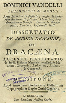 リンネの2つの著作の翌年、バンデリーは Dracaena属についての40ページほどの冊子を書いた。タイトルは、正確ではないかもしれないが、『巨木(リュウケツジュ)についての論文