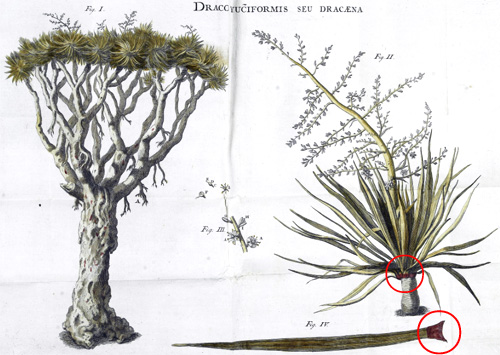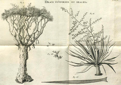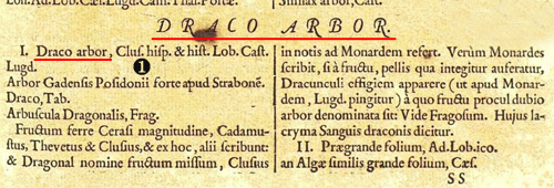 まさに リュウケツジュ であり、葉の形状や花、実もリアルに描かれている。 Draco という言葉は植物名以外にも、Draconis, Draconem, Dracone などがあり、「巨大な、大きな」という形容詞として使われていると思われる。