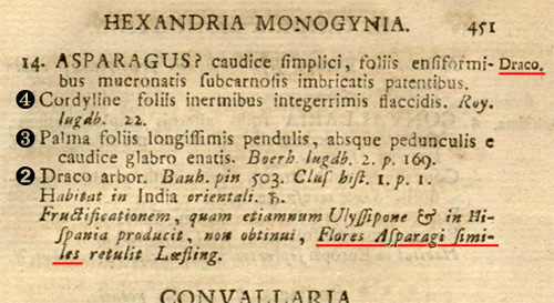 これまでに記載した数種を Dracaena属に変更したもので、1. が本種。各記述は極めて短く、参考文献としてAsparagus Draco