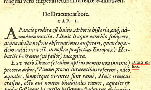 またリンネよりも200年前に「二名法」による植物名の記載(欄外 赤線 Draco arbor)を行っている。 |
