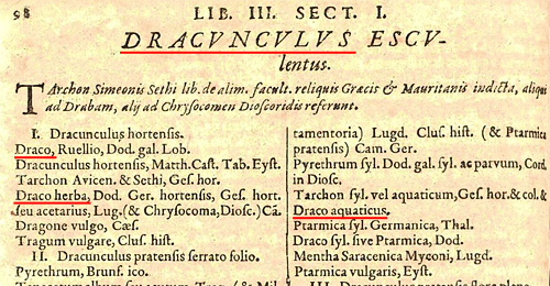 | サトイモ科 Dracunculus 竜のしっぽ(尻)属 の項に、「Draco herba 草の竜」の名がある。そこには、ボーアンよりもさらに100年前の、ドドエンス