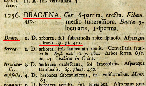 リンネが初めて Dracaena属を記載したものだが、属名に続けて