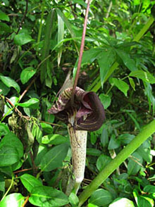 | Dracunculus属は現在も健在で、葉は鳥足状、花は暗紫紅色の仏炎苞。これに似ているのがテンナンショウ属のウラシマソウ。 |